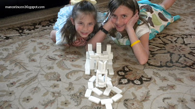 My husband hates to get his hair cut. When it gets long enough, I threaten him with letting the girls have at him. Here's their latest creation. Needless to say, he succumbed and got his hair cut as soon as he could get the ribbons and barrettes out. Our cat - she's not generally very patient. She especially likes to come and lay down on top of your book if you are reading, or in the middle of your game. No matter what you are doing, she wants to be part of it. Unfortunately, during the winter months, our cat gets a little stir crazy and doesn't like to be outdoors in the cold. This translates into unpredictability and crankiness. You never know when she'll actually cooperate or not. My daughter was recently playing with the dominoes, and the kitty came and interupted her play.